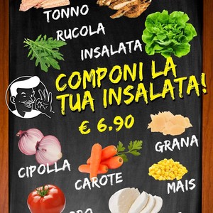insalata, straccetti di pollo, crostini di pane e grana in scaglie