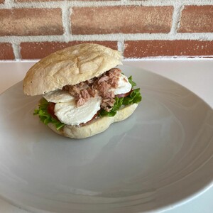 Pane malfatto, tonno, insalata, pomodoro e mozzarella.